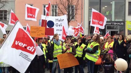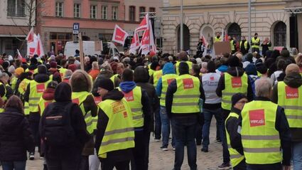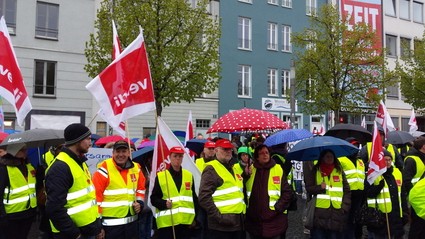 Warnstreik im Regen – Mit Trillerpfeifen und neongelben Warnwesten haben heute Vormittag knapp 500 Beschäftigte des Öffentlichen Dienstes in Ingolstadt für mehr Gehalt demonstriert. Verdi hat zum Warnstreik und zu der Kundgebung auf dem Paradeplatz aufgerufen. Verdi-Sprecherin Steffi Kempe betonte die Gewerkschaftsforderung von 6 Prozent mehr Gehalt für die Beschäftigten im Öffentlichen Dienst. Darüber hinaus wolle man 100 Euro mehr für die Auszubildenden. Außerdem sei es wichtig, dass es keinen Eingriff in die betriebliche Altersvorsorge gebe, so Kempe. Die Arbeitgeber bieten momentan 0,6 Prozent in diesem und 1,2 Prozent für das kommende Jahr an. Weitere Protest-Aktionen „in verrschärfter Form“, so Verdi, seien in nächster Zeit nicht ausgeschlossen. An dem heutigen Warnstreik haben unter anderem Mitarbeiter der Krankenhäuser Eichstätt, Kipfenberg und Ingolstadt, der Sondermüllverbrennungsanlage Baar-Ebenhausen und des Hallenbads Schrobenhausen teilgenommen.